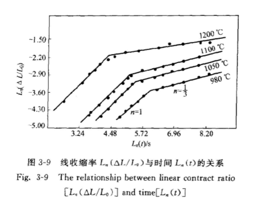 即線(xiàn)收縮率△L/La正比于時(shí)間t。根據(jù)普通粉體以擴(kuò)散傳質(zhì)為主的固相燒結(jié)模型,初期燒結(jié)的動(dòng)力學(xué)關(guān)系為△L/ L=kt對(duì)于不同的擴(kuò)散傳質(zhì)機(jī)理,式中指數(shù)n取值在2.5~5之間變化。