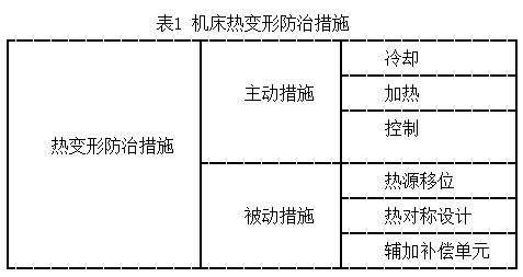 陶瓷磨床的剛度一直是人們關(guān)注的重點(diǎn)。引起機(jī)床結(jié)構(gòu)變形的主要因素包括熱變形、靜載荷、動(dòng)載荷以及殘余應(yīng)力等。其中,熱變形是機(jī)床變形的主要因素,因?yàn)闄C(jī)床結(jié)構(gòu)的熱變形將會(huì)引起工件相對(duì)砂輪位置的改變。為了減少溫度場(chǎng)對(duì)機(jī)床結(jié)構(gòu)的影響,可以采用各種措施,包括主動(dòng)措施和被動(dòng)措施,如表1所列。