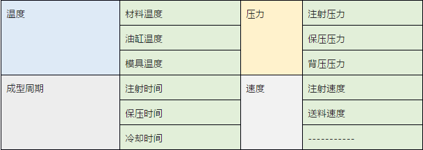 注射成型過程工藝參數(shù)涉及溫度、成型周期、壓力、速度四個(gè)方面,具體參數(shù)如表所示。